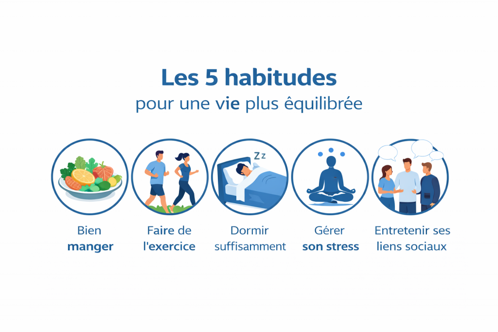 Vivre de façon équilibrée ne signifie pas atteindre la perfection, mais instaurer des habitudes durables qui harmonisent le corps, l’esprit et le rythme quotidien. Dans cet article, je vous propose cinq habitudes concrètes , sélectionnées d’après des sources fiables, que vous pouvez intégrer progressivement pour créer une base solide de bien-être.